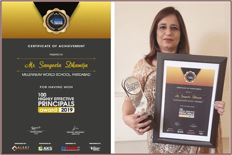 Thus it is in the honour of this distinction that MS Sangeeta Dhamija is bestowed with the Certificate of achievement and an award of “100 Highly Effective Principals” by AKS EDUCATION AWARDS. The award recognizes meritorious principals for their valuable contributions to schools and crowns those principals, who have spearheaded initiatives to increase students’ performance for stakeholder satisfaction, endorse safe learning environment for its pupils and create partnerships with parents and ensure better involvement with its community members.